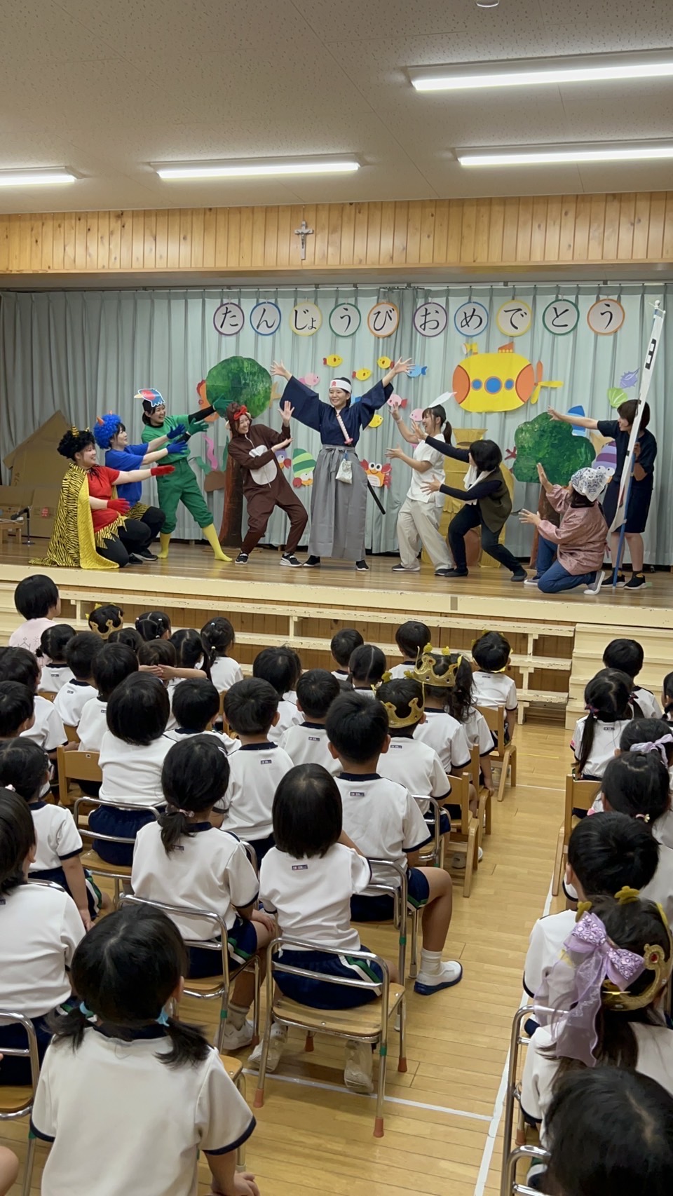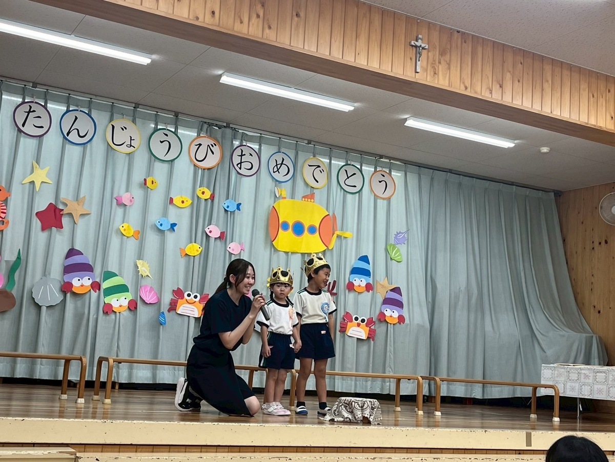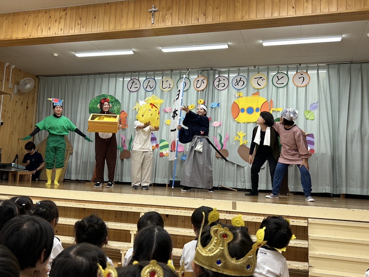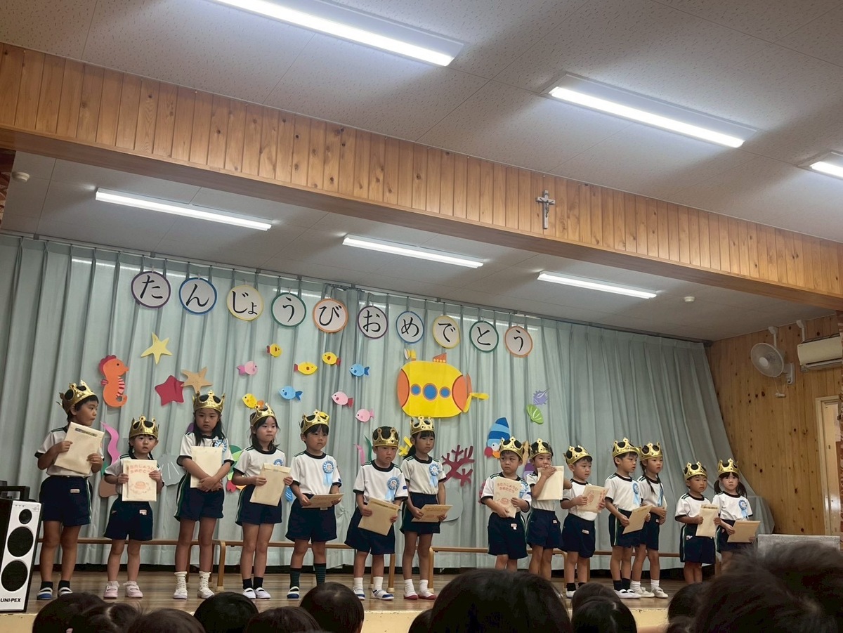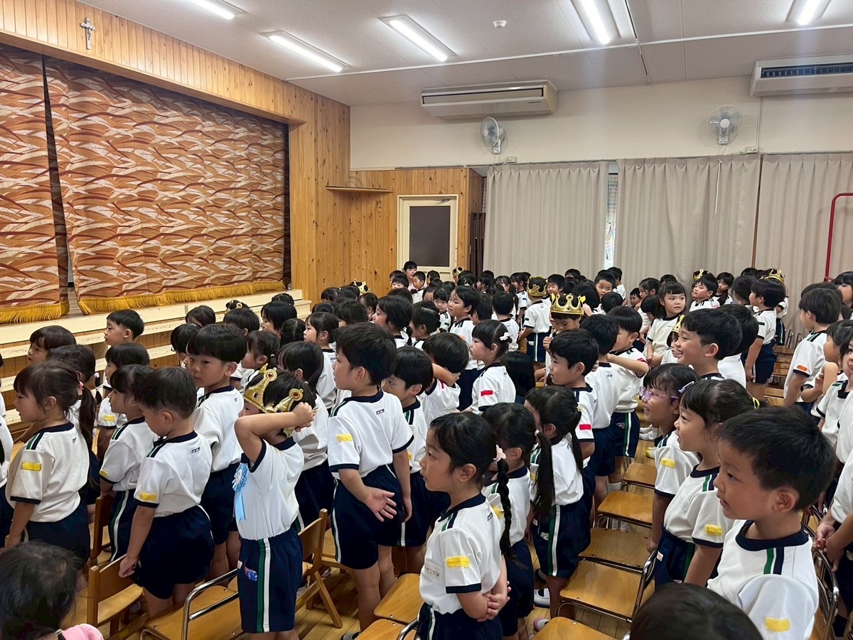 8月生まれの誕生会がありました。 2025年10月06日(月) 夏季保育2日目に行われた誕生会。 久しぶりの幼稚園でしたが、元気に発表できました! 今月のお楽しみは、みんなが知ってる昔ばなしの『ももたろう』を 先生たちがちょっぴりアレンジ☆ 笑い声の止まらない楽しい時間となりました。 おやつには冷たいクレープを食べて大満足!! みんなニコニコの一日でした~ また来月もお楽しみに♪