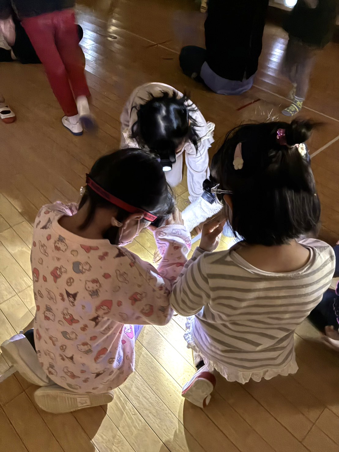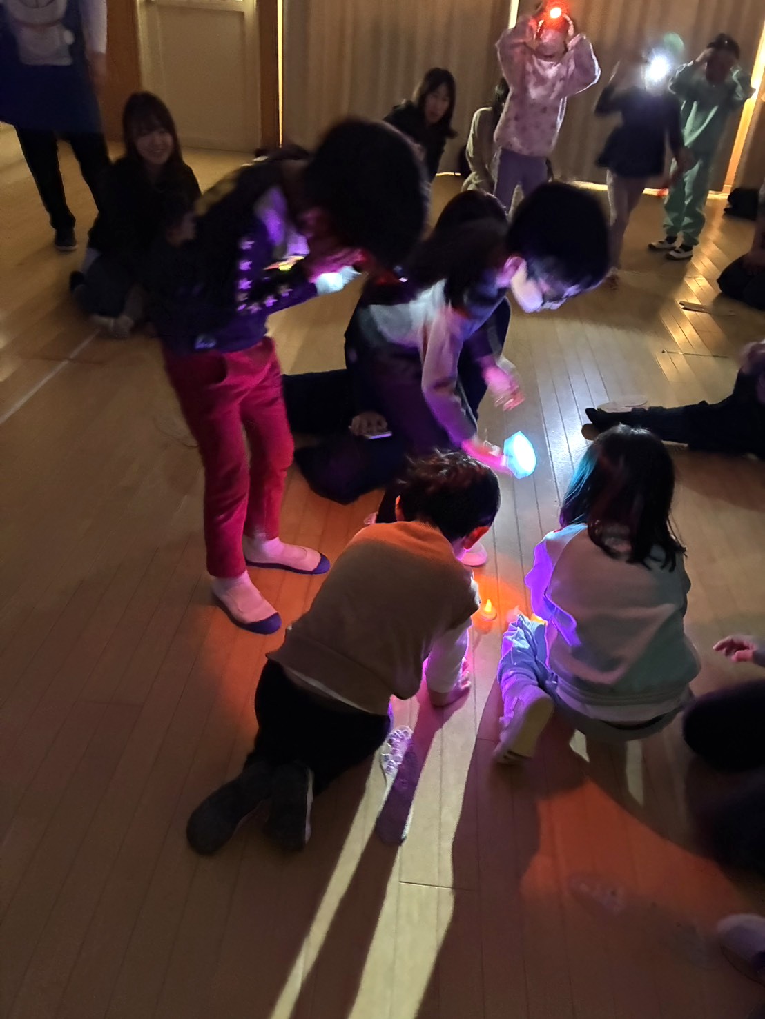 頭を動かすと光がふわりと揺れる。電気の遊びに子どもたちは目を輝かせていました✨