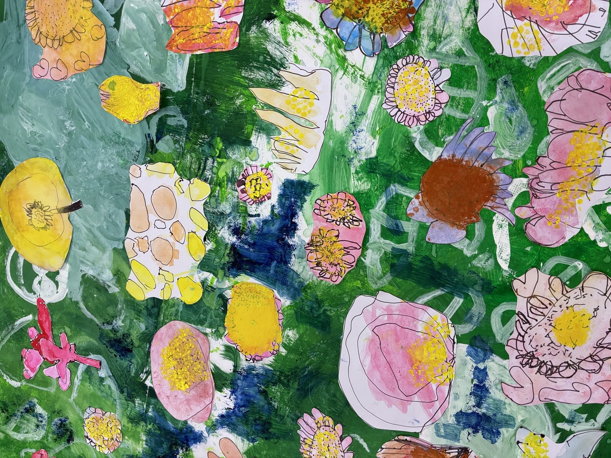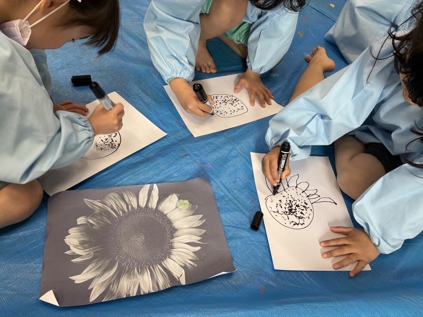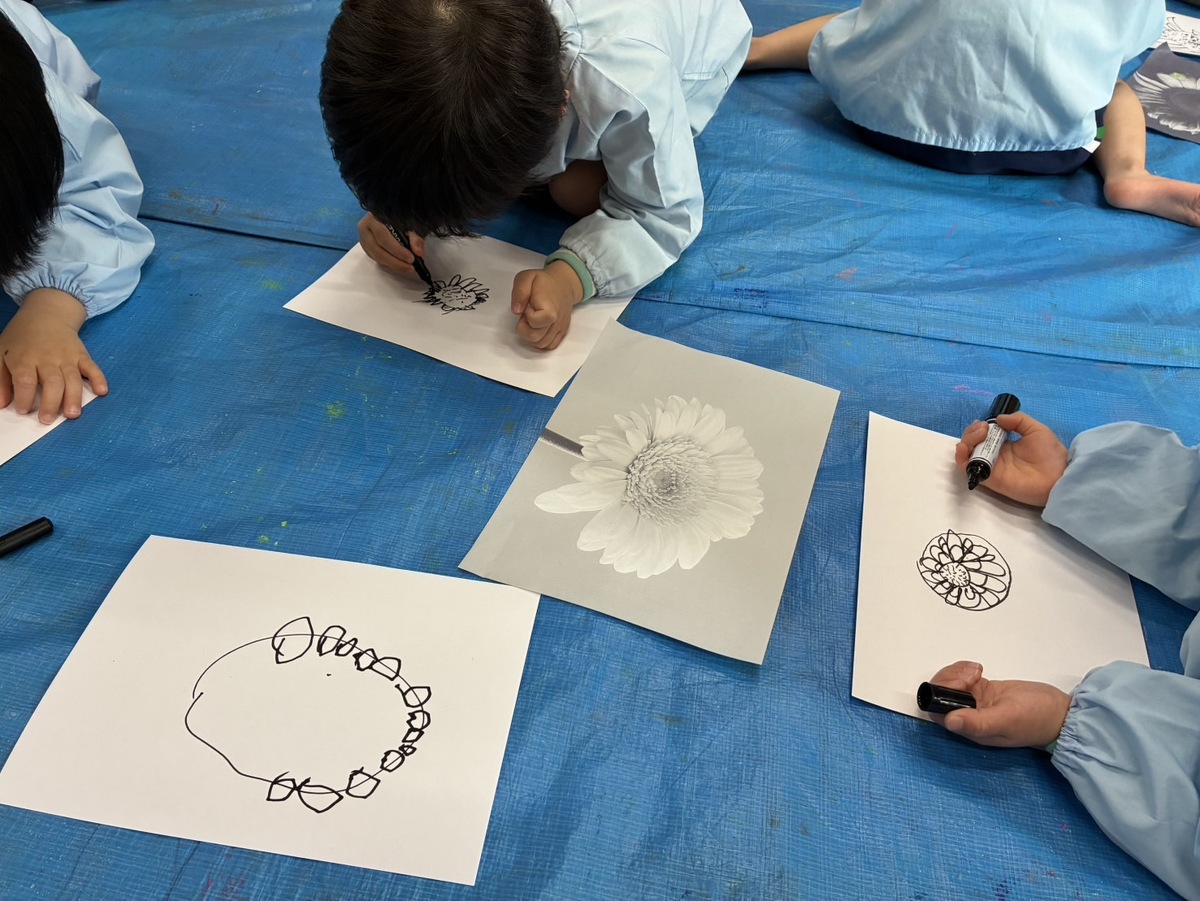<3歳児>アートの日 2026年03月11日(水) 3歳児の子どもたちが、後藤先生と一緒にアートの時間を楽しみました✨ モノクロで印刷したお花の写真をじっと見つめながら、感じたことを一人ひとりがのびのびと表現しました。 今のこの時だからこそ描ける、まっすぐで、力いっぱいの花たち。 小さな手から生まれた生命力あふれるお花がやさしく咲きそろいました。 この作品は、春から太田駅に展示される予定です。 どうぞ、お楽しみに✨