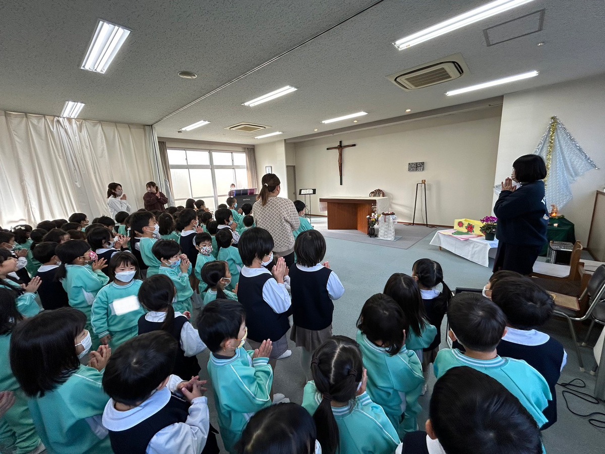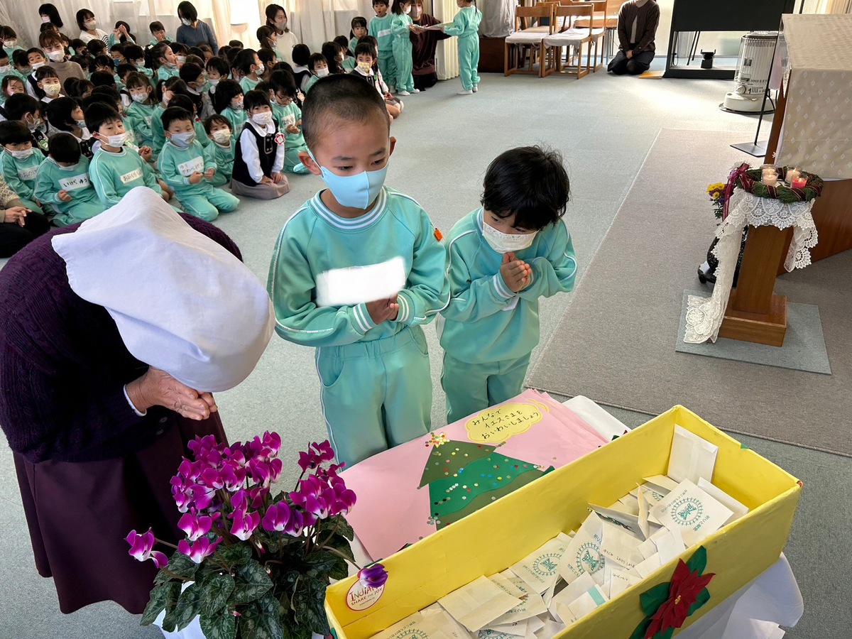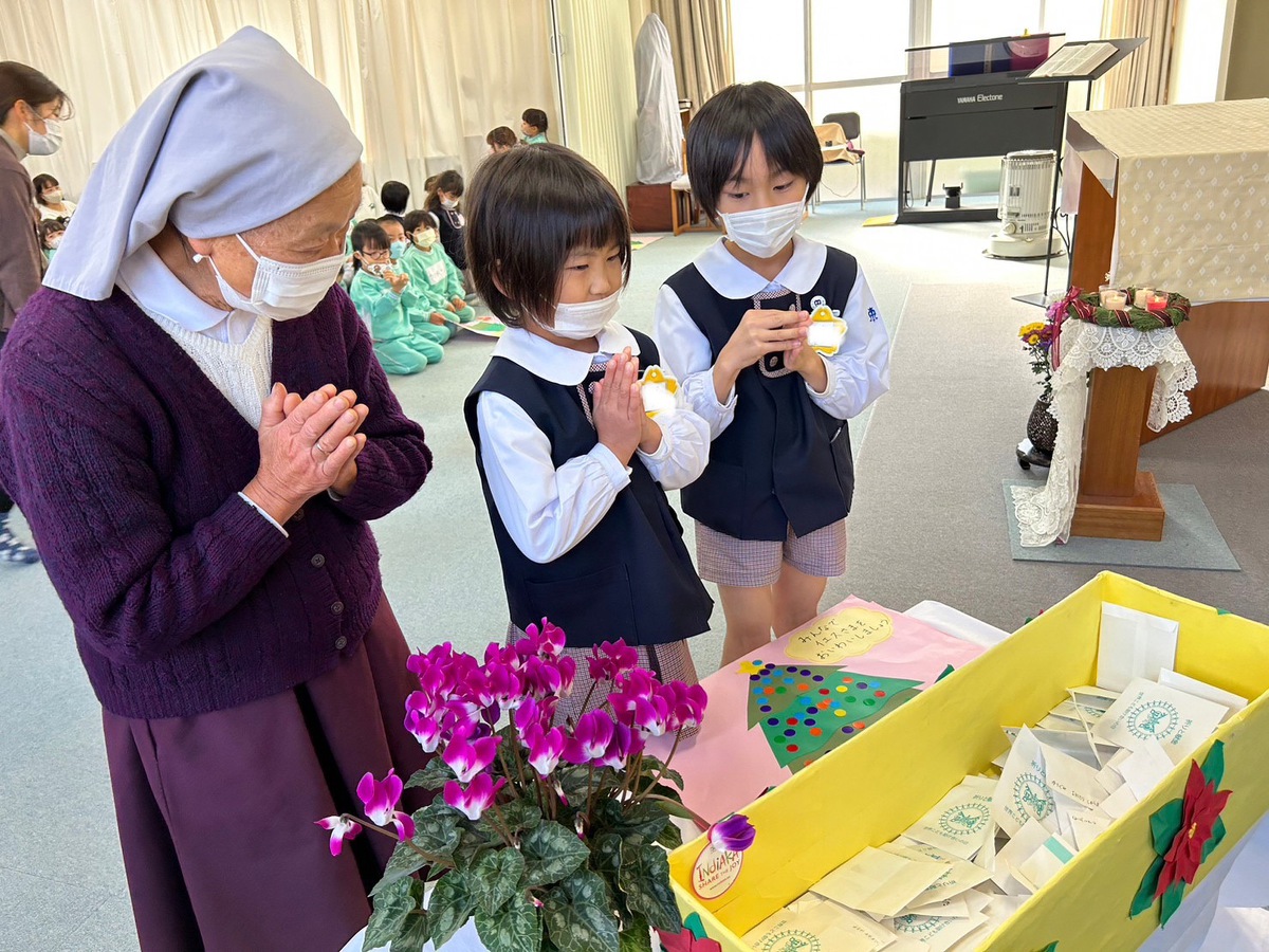 2学期の終業式を行いました。 2022年12月20日(火) 2学期の終業式を行いました。幼稚園では、待降節の間、まわりの人に対して「温かい心・ことば・まなざし・行い」等思いやりの気持ちや感謝の気持ちを持てるように各クラスで1つの「はげみ表」に取り組みました。また、ご家庭のご協力を頂いて、「子どもたちの心のプレゼント」として献金をお捧げしました。2学期も元気に過ごすことができましたね。また、来年皆さんに会えるのを楽しみにしています。