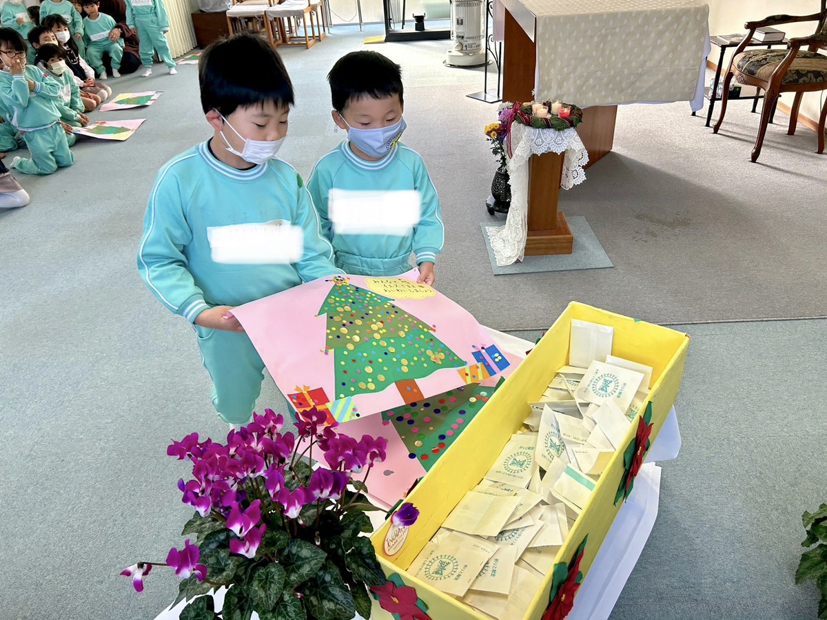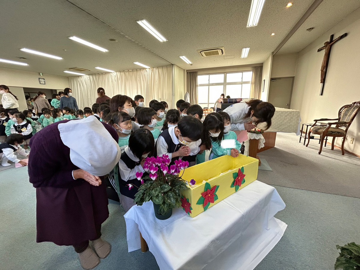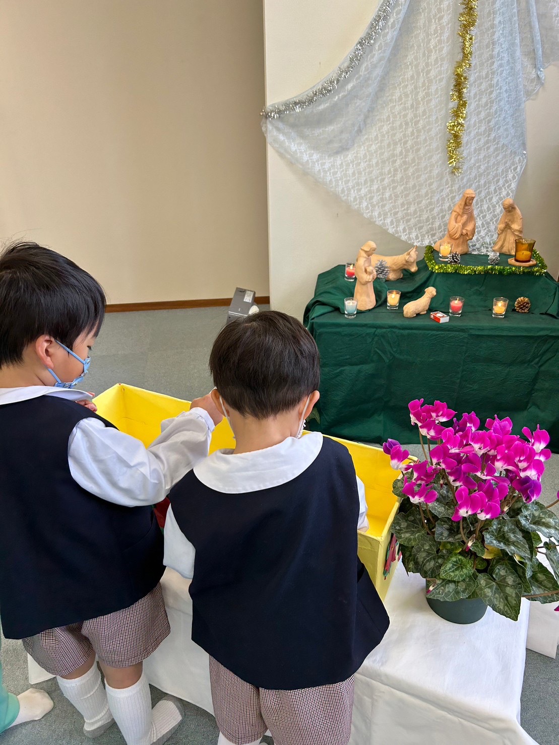 2学期の終業式を行いました。 2022年12月20日(火) 2学期の終業式を行いました。幼稚園では、待降節の間、まわりの人に対して「温かい心・ことば・まなざし・行い」等思いやりの気持ちや感謝の気持ちを持てるように各クラスで1つの「はげみ表」に取り組みました。また、ご家庭のご協力を頂いて、「子どもたちの心のプレゼント」として献金をお捧げしました。2学期も元気に過ごすことができましたね。また、来年皆さんに会えるのを楽しみにしています。