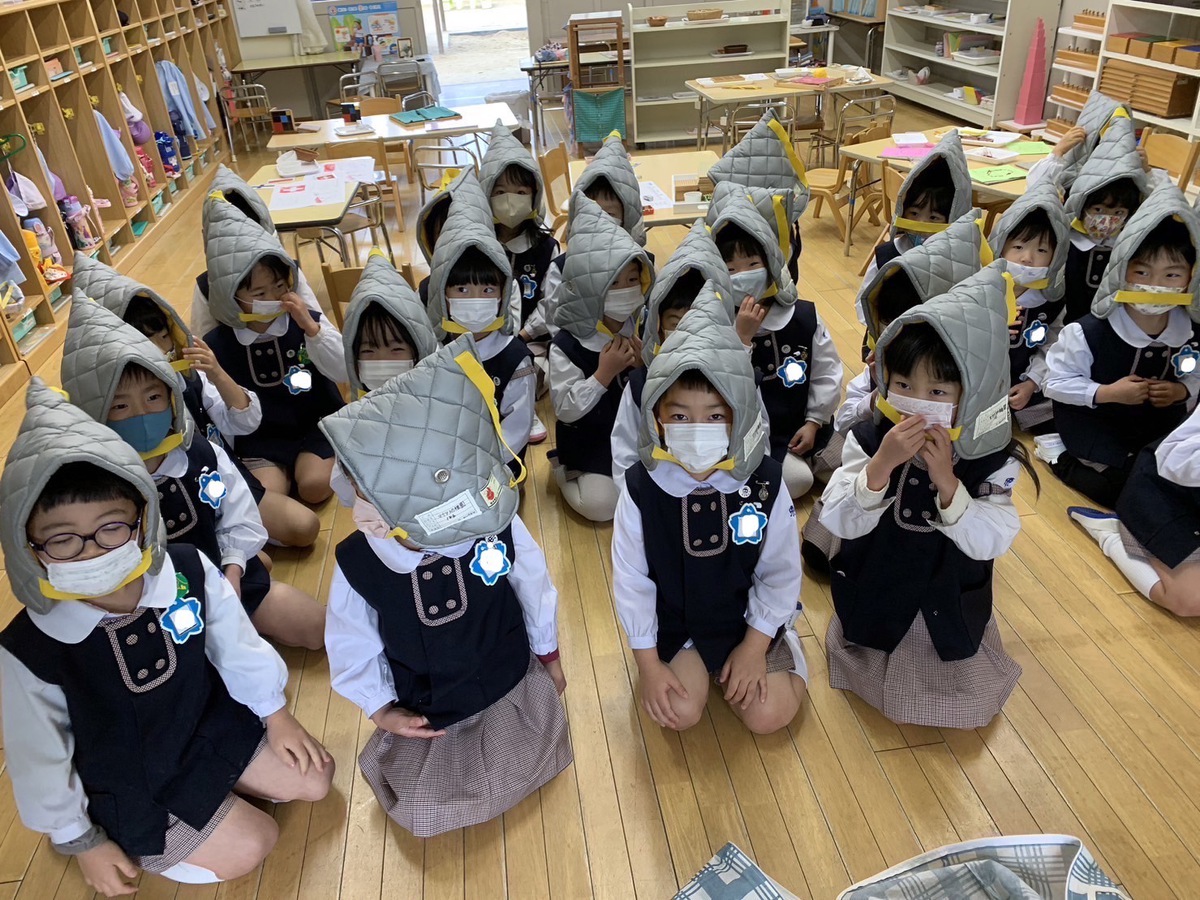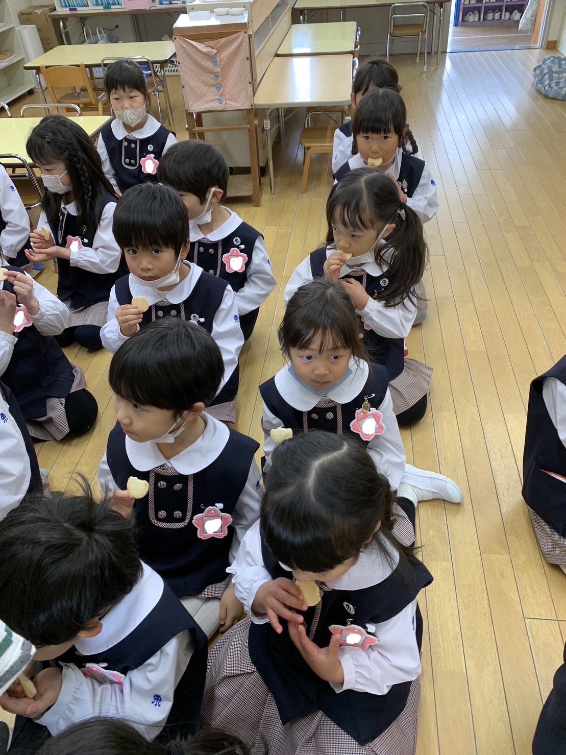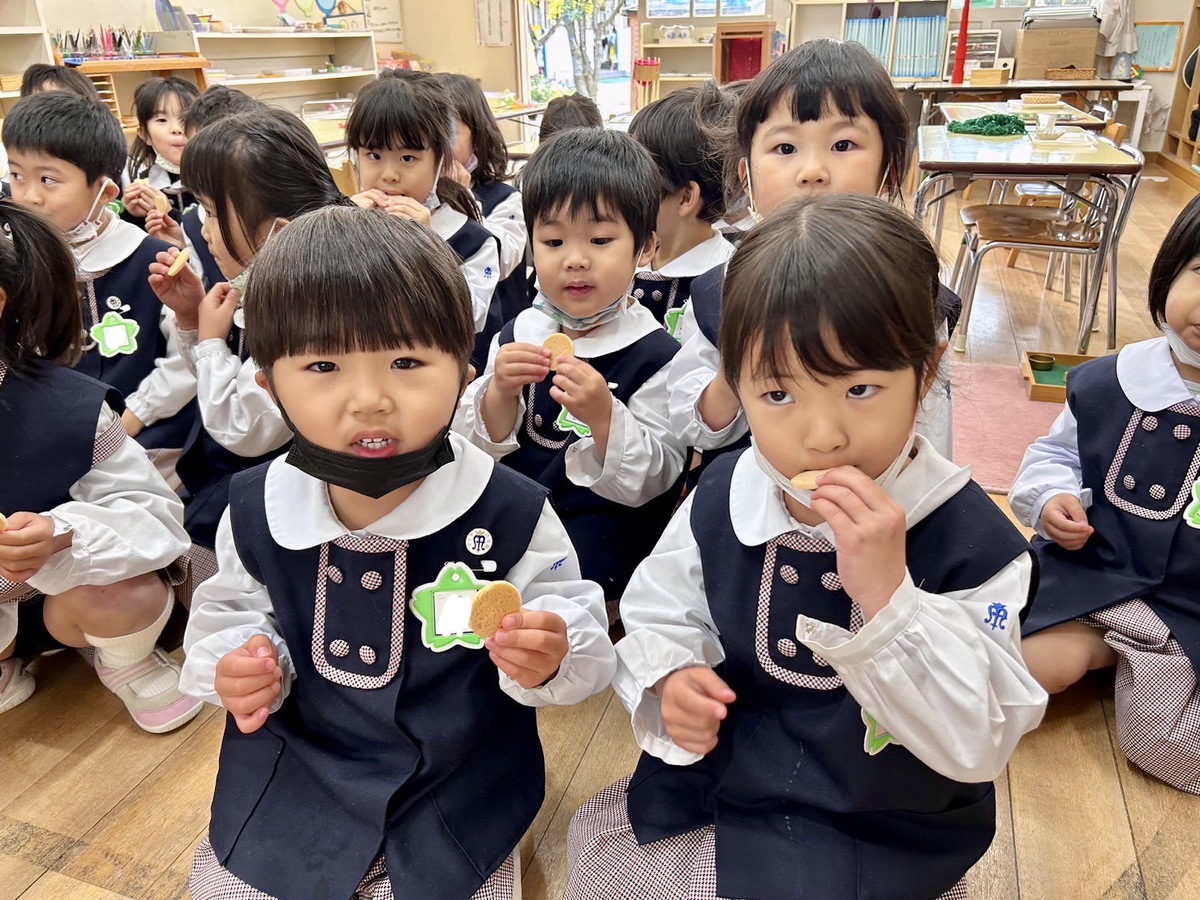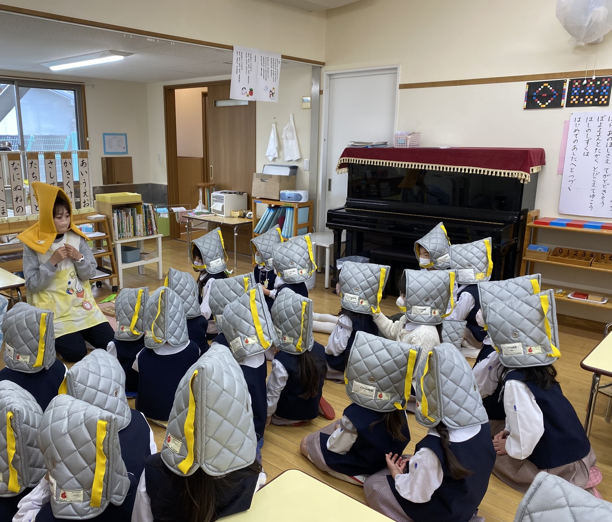 地震の避難訓練を行いました。 2023年01月24日(火) 地震の避難訓練を行いました。実際に地震の音を聞いて様子を体験しながら机の下に避難しました。その後、非常食のクッキーを試食しました。先生から、「非常食は3年も持つんだよ。みんなが幼稚園に入園した時から卒園するくらいまでの長い間だよ。」というお話を聞いて、「すごい!」と驚き、感心しながら美味しく食べることができました。