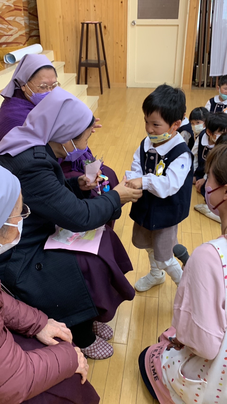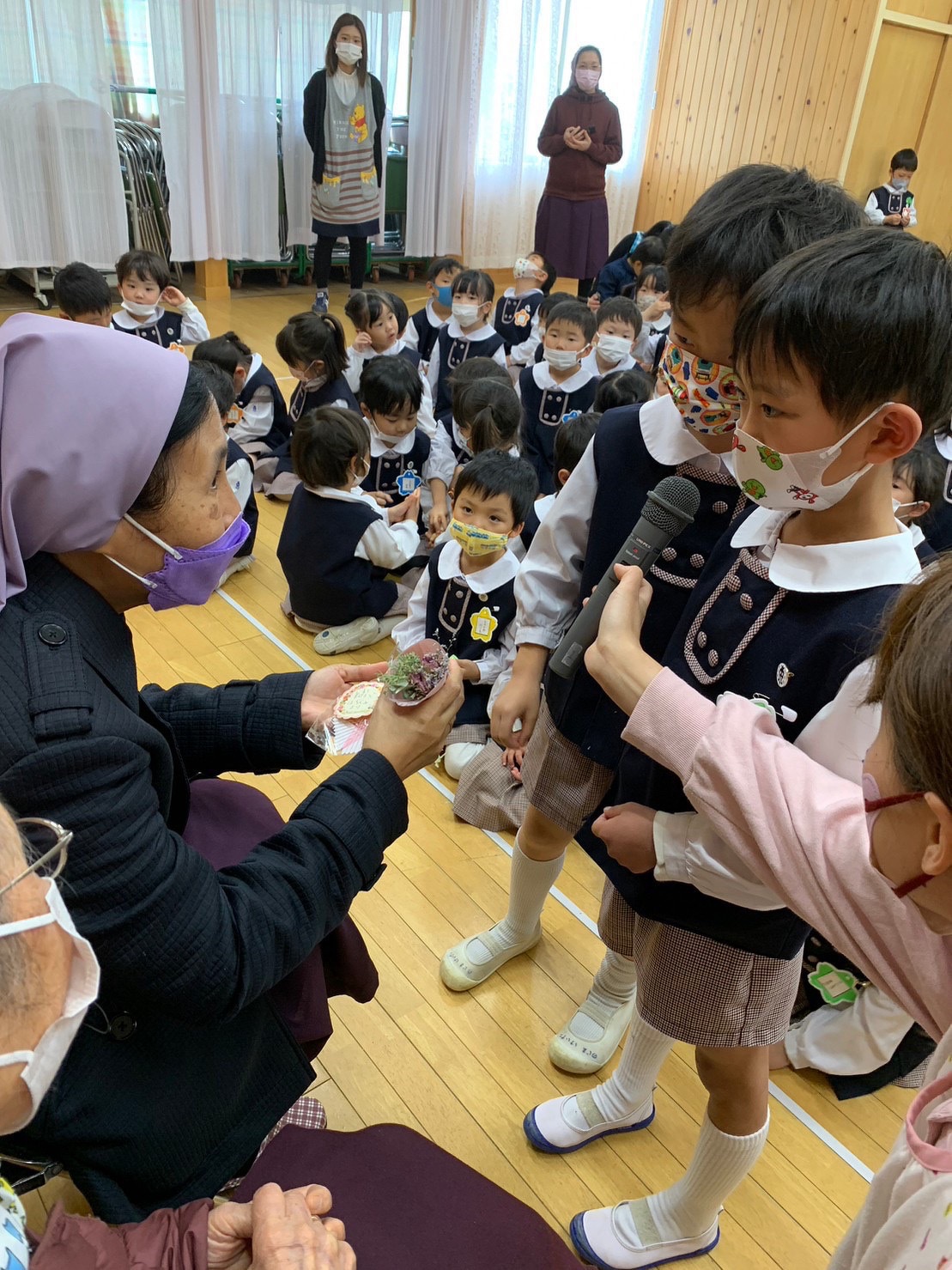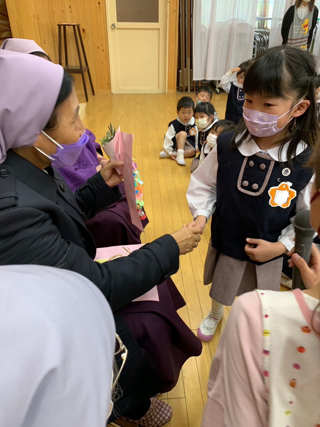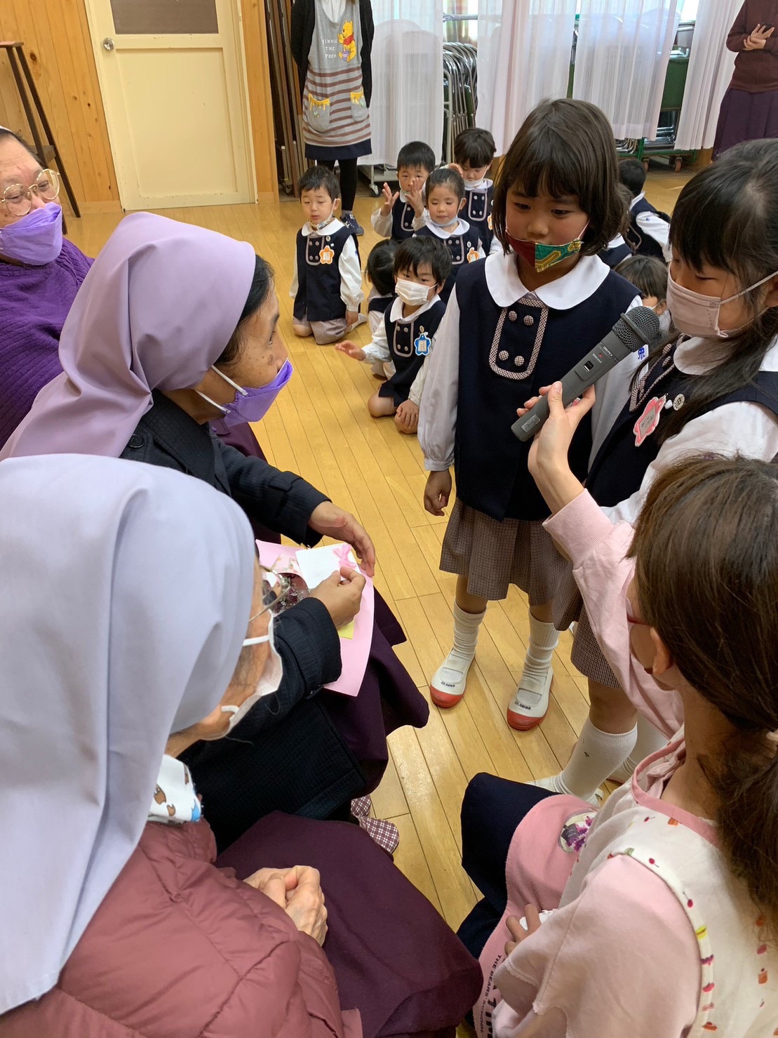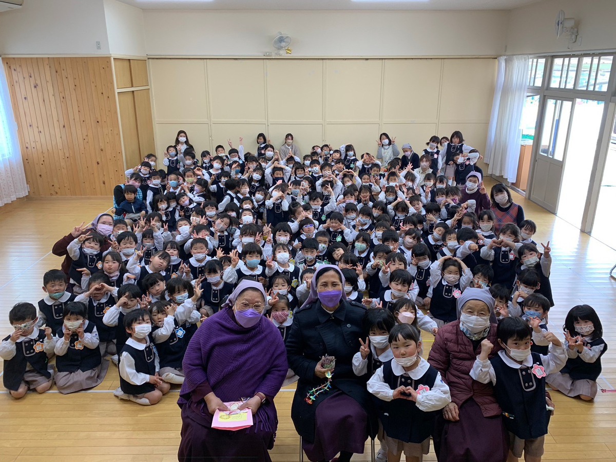 フィリピンからシスターがマリア幼稚園に遊びに来てくれました。 2023年03月09日(木) フィリピンからシスターがマリア幼稚園に遊びに来てくれました。みんなでシスターに質問をしたり、歌のプレゼントをしました。子どもたちの素敵な歌声にシスターもとても喜んでくださいました。楽しい時間を過ごすことができました。 「シスターレルマ、シスターアンナ、 またあそびにきてね〜!!」