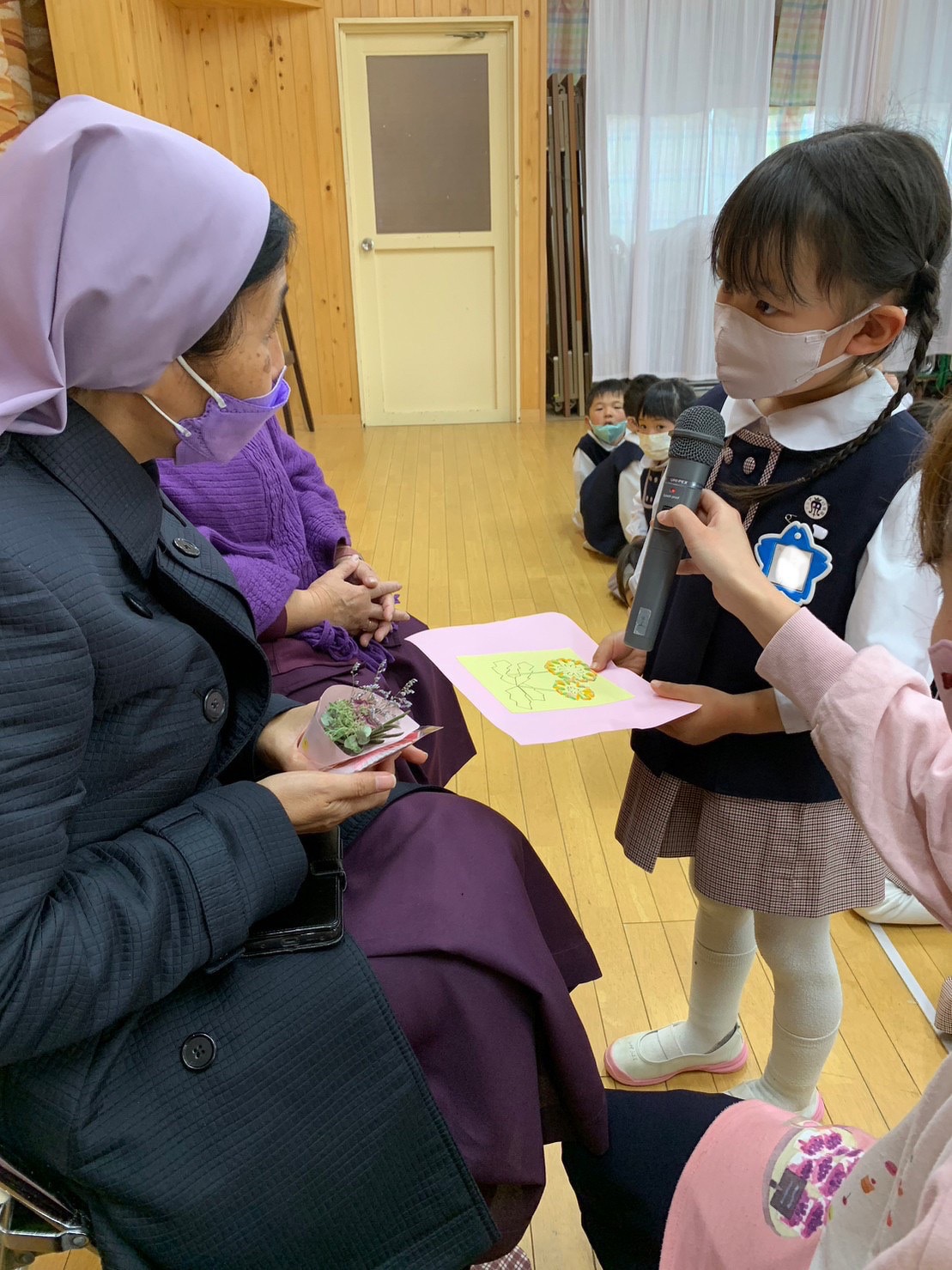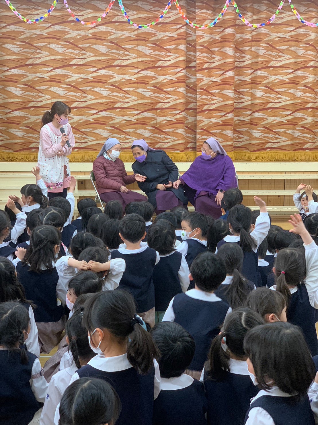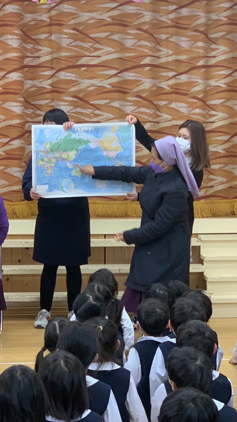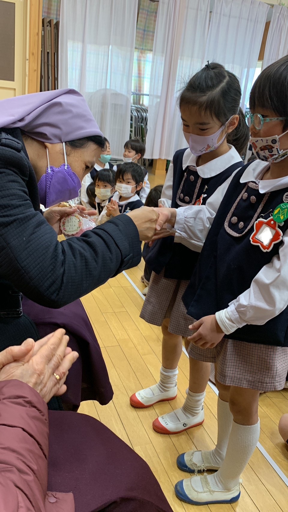フィリピンからシスターがマリア幼稚園に遊びに来てくれました。 2023年03月09日(木) フィリピンからシスターがマリア幼稚園に遊びに来てくれました。みんなでシスターに質問をしたり、歌のプレゼントをしました。子どもたちの素敵な歌声にシスターもとても喜んでくださいました。楽しい時間を過ごすことができました。 「シスターレルマ、シスターアンナ、 またあそびにきてね〜!!」